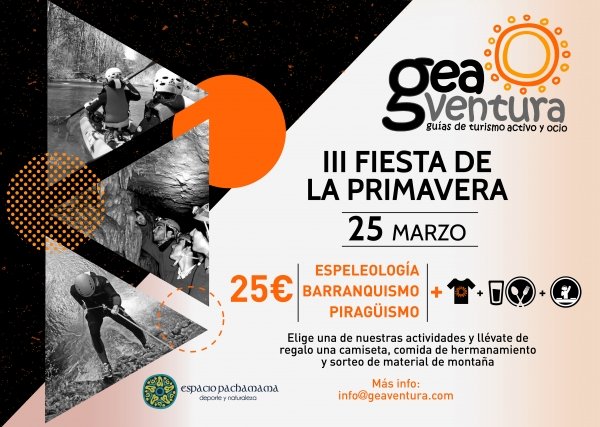 Comenzamos la temporada 2017 y por tercer año consecutivo lo celebramos ofreciendo todos nuestros amigos un día muy especial. El sábado 25 de marzo dentro del programa de la III Fiesta de la Primavera GEA tenemos previstas salidas para nuestras tres actividades estrella, barranco, cueva y piraguas, con comida, camiseta, sorteo de material, acceso a todo el evento por solo 25? por persona.